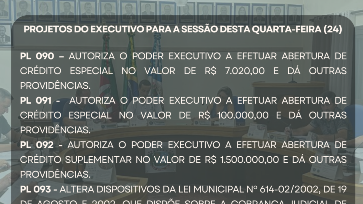 A Câmara Municipal de Vereadores convida a comunidade para a sessão ordinária que acontecerá nesta quarta-feira, dia 24 de setembro, às 19h. A pauta completa está disponível no site: www.camaracolinasrs.com.br/projetosdelei.