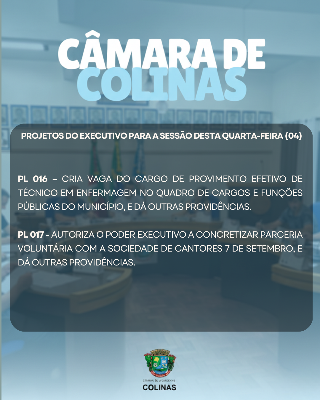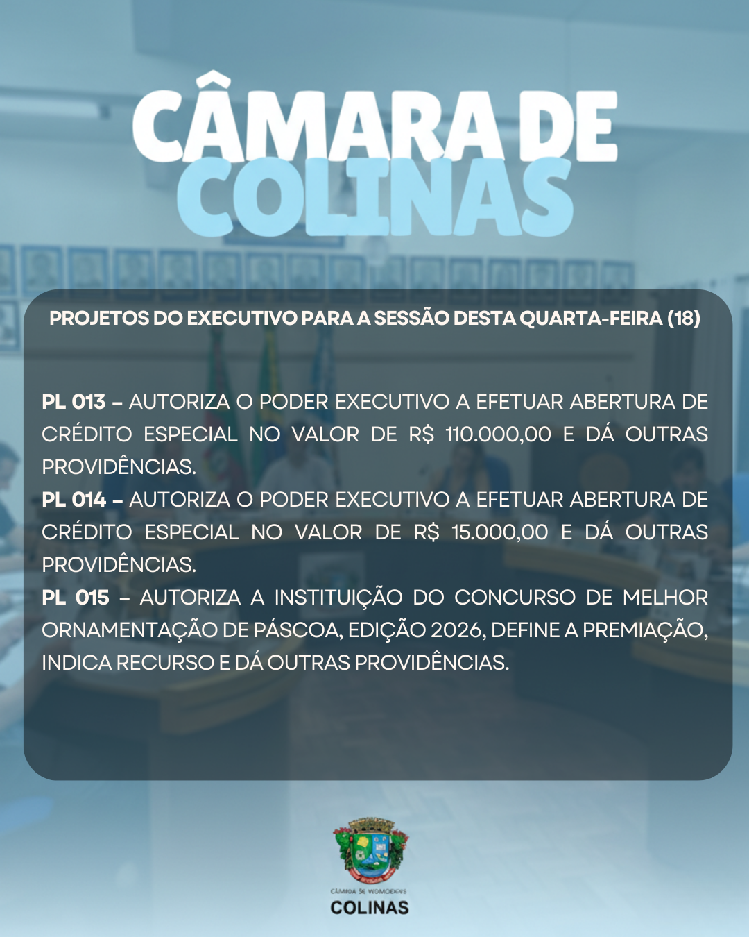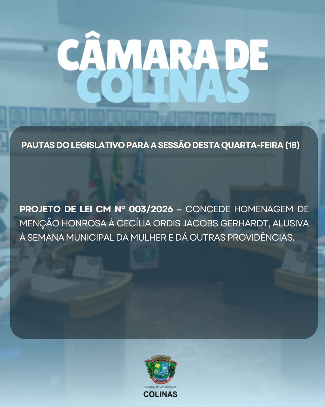 A Câmara Municipal de Vereadores convida a comunidade para a sessão ordinária que acontecerá nesta quarta-feira, dia 18 de fevereiro, às 19 horas. A pauta completa está disponível no site: https://camaracolinasrs.com.br/projetos-lei/