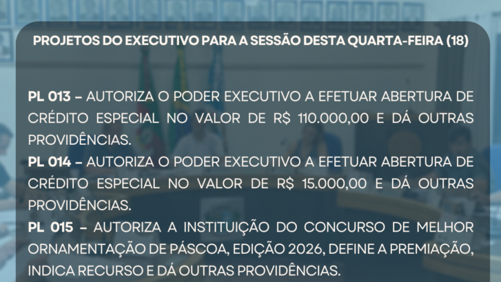 A Câmara Municipal de Vereadores convida a comunidade para a sessão ordinária que acontecerá nesta quarta-feira, dia 18 de fevereiro, às 19 horas. A pauta completa está disponível no site: https://camaracolinasrs.com.br/projetos-lei/
